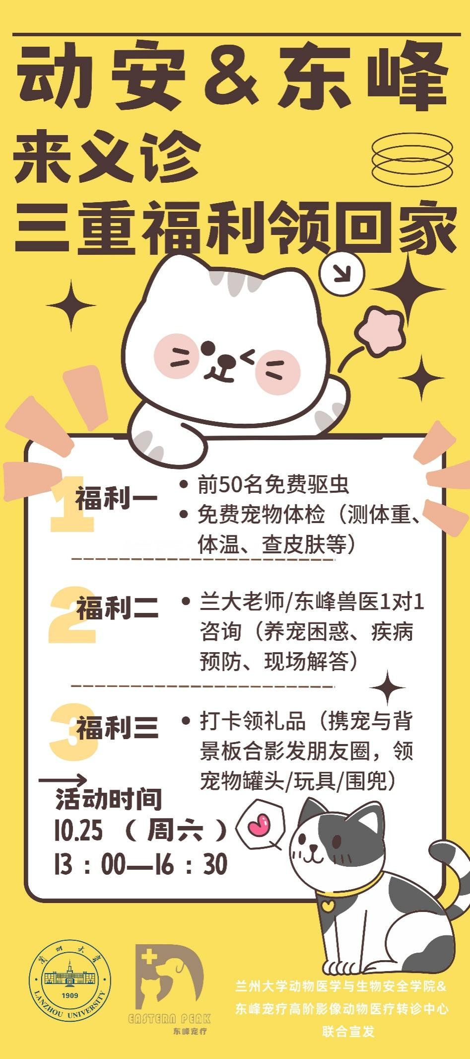 通知公告为深入贯彻ONE HEALTH“人与动物和谐共处,大健康,全健康”理念,动物医学与生物安全学院联合东峰宠疗举办“金秋送暖、爱宠相伴”伴侣动物健康义诊主题党日活动,关怀家庭伴侣动物健康,助力兰大社区养宠幸福指数提升。