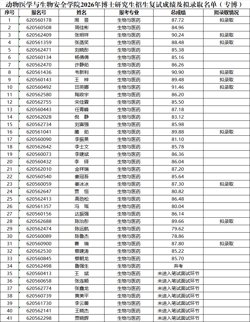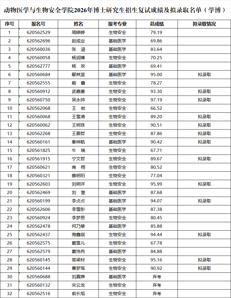 根据《动物医学与生物安全学院动物医学与生物安全学院2026年博士研究生招生“申请-考核”实施方案》,现将动物医学与生物安全学院2026年第一批博士研究生招生复试成绩及拟录取名单予以公示,公示期为2026年1月20-23日。