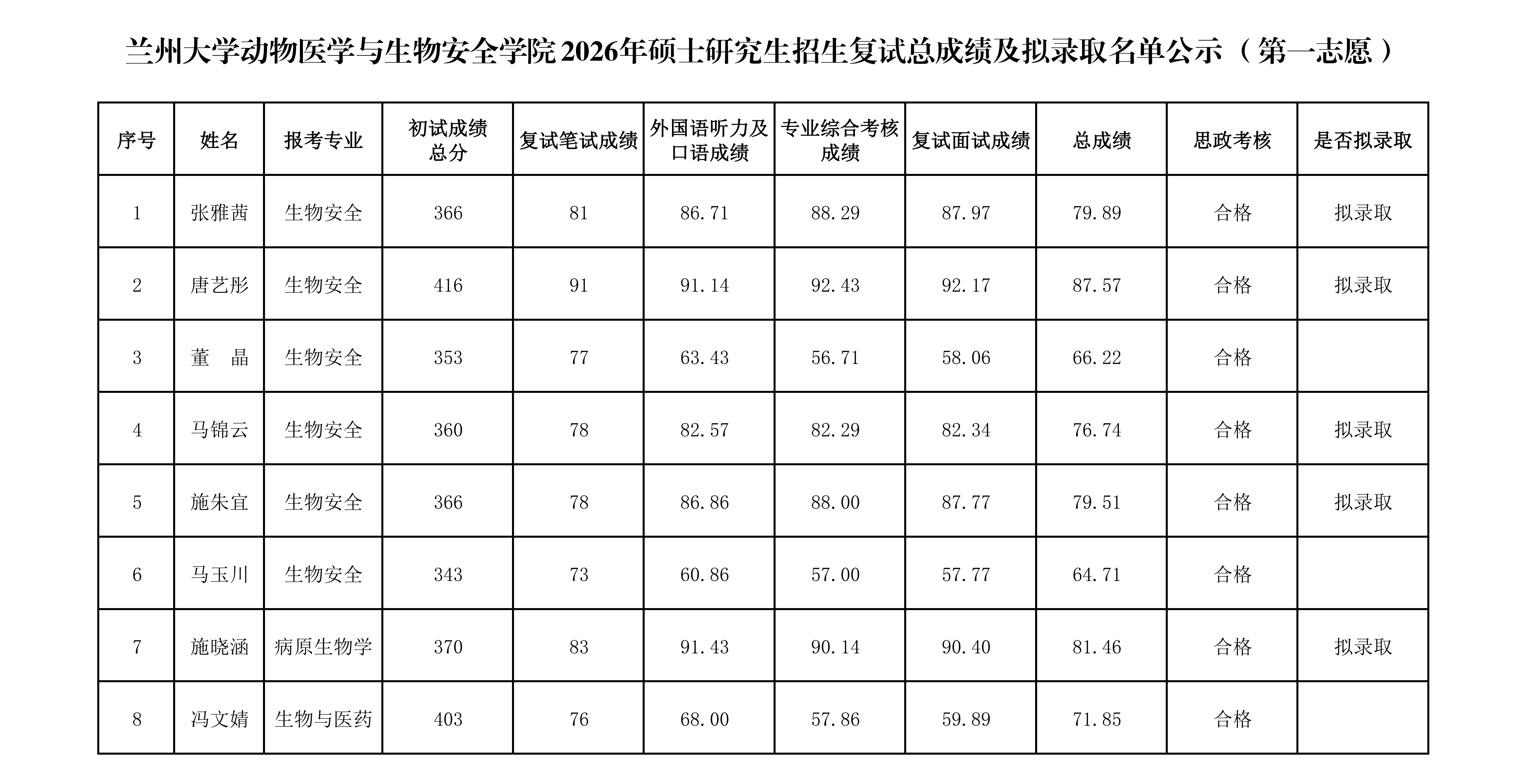 兰州大学动物医学与生物安全学院2026年硕士研究生复试录取实施细则