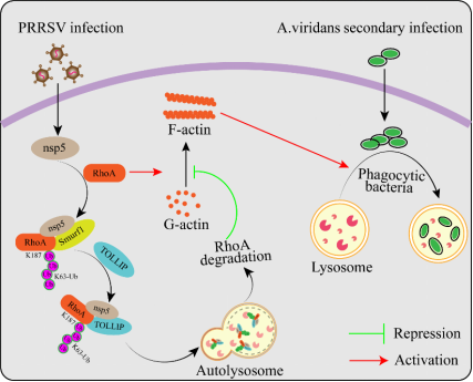 近日,该团队针对入侵的细菌如何逃逸巨噬细胞靶向清除的科学问题,以“PRRSV-2 impedes lysosomes from eliminating secondary infected bacteria”为题,在《PLOS Pathogens》发表文章。该研究发现,PRRSV感染后通过病毒非结构蛋白nsp5招募E3泛素连接酶Smurf1,诱导“肌动蛋白调节器”RhoA蛋白的多聚泛素化修饰,进一步在自噬受体TOLLIP的作用下经自噬-溶酶体途径降解RhoA蛋白。RhoA蛋白降解后,其介导肌动蛋白单体G-actin向丝状肌动蛋白F-actin的合成过程受阻,有效限制了巨噬细胞内溶酶体的定向运输,阻碍巨噬细胞靶向清除继发感染的细菌,从而利于继发感染的细菌存活。