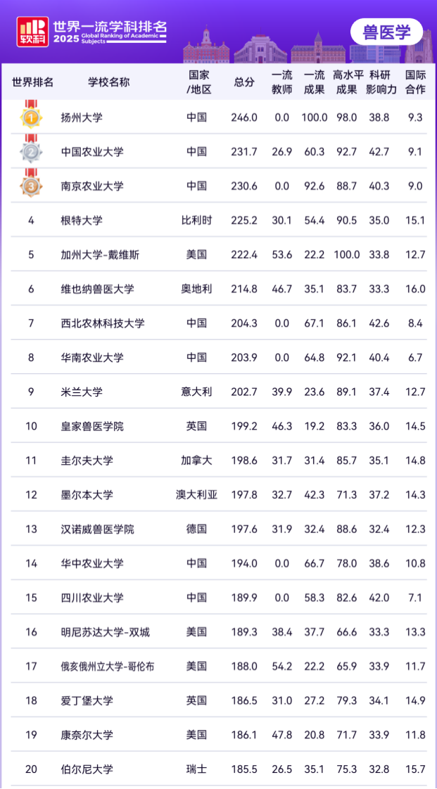 学院新闻11月18日,2025软科世界一流学科排名(简称GRAS)正式发布,兰州大学兽医学学科世界排名首次进入世界前100名,位列第76-100名区间,成为全校5个跻身世界前100名的学科之一。